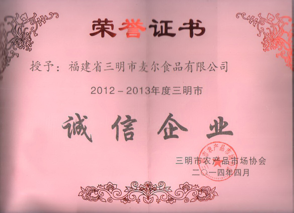 2014年9月12日,從三明市農(nóng)產(chǎn)品市場協(xié)會(huì)得知,公司被授予“2012~2013年度誠信企業(yè)”稱號(hào)。